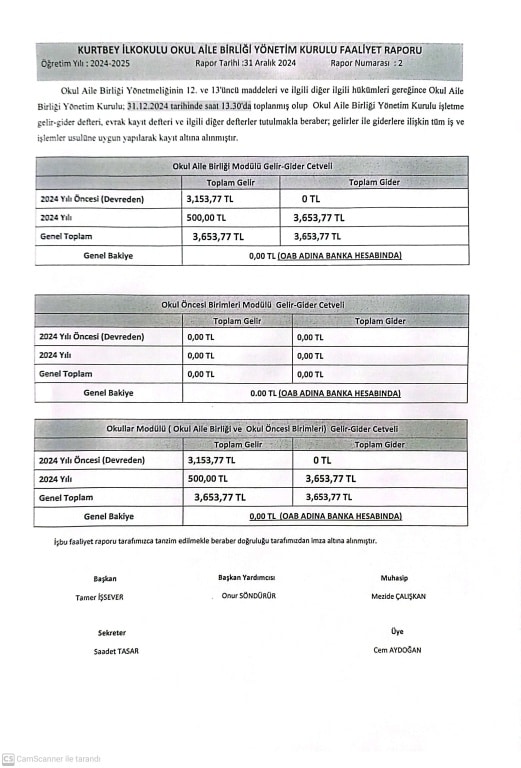 KURTBEY İLKOKULU/ORTAOKULU 31.12.2024 TARİHİ İTİBARİYLE OKUL AİLE BİRLİĞİ 2024 YIL SONU MALİ RAPORUDUR