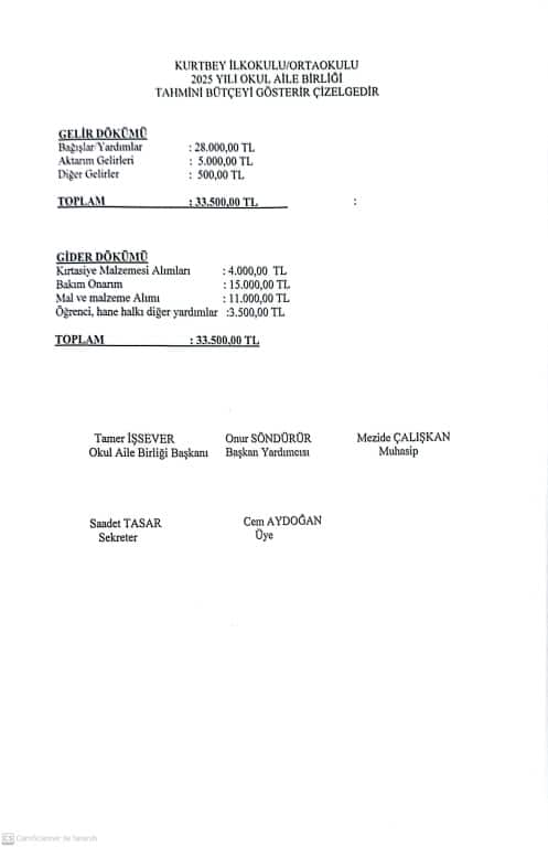 KURTBEY İLKOKULU/ORTAOKULU OKUL AİLE BİRLİĞİ 2025 YILI TAHMİNİ BÜTÇE TABLOSUDUR
